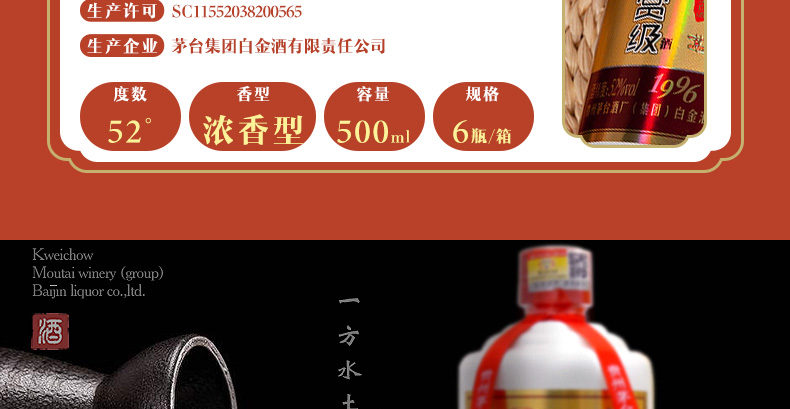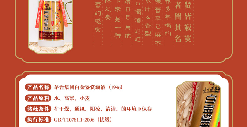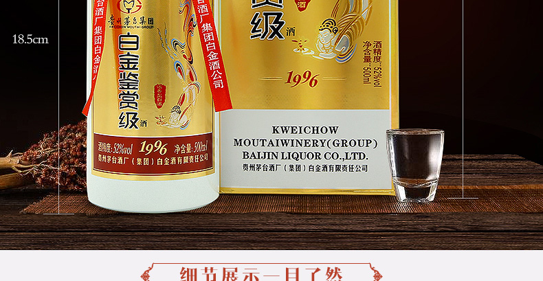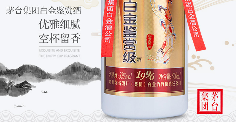 茅臺(MOUTAI)集團白金酒白金鑒賞級酒1996 52度濃香型白酒 高粱糧食酒 500ML*單瓶 |