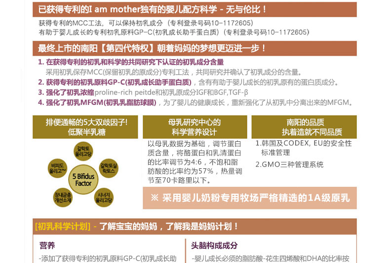韓國直郵[南陽奶粉]我是媽媽/小袋包裝 1段 共3盒(14g*20包/盒) 適合0~100天大的寶寶—— ①含有免疫成分slga,成長因子IGF,促進(jìn)細(xì)胞成長的EGF及TGF-β等可促進(jìn)成長,提高免疫力。 ②南陽乳業(yè)特許成分GP-C(Growth Protein-Colostrum),能使成骨細(xì)胞機(jī)能活性化,增大牙骨細(xì)胞,有助于骨骼的形成和生長。 ③在韓國國內(nèi)唯一使用天然DHA愛恩斯坦原乳,有助于提高嬰兒大腦的發(fā)育。 ④適合出生1~2歲的寶寶 |
