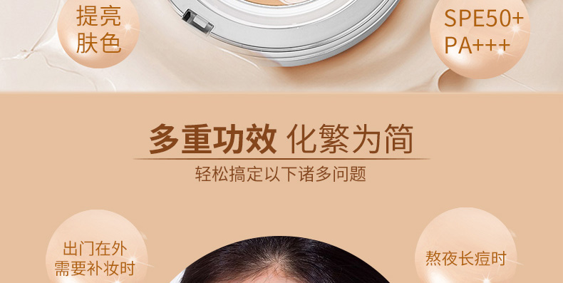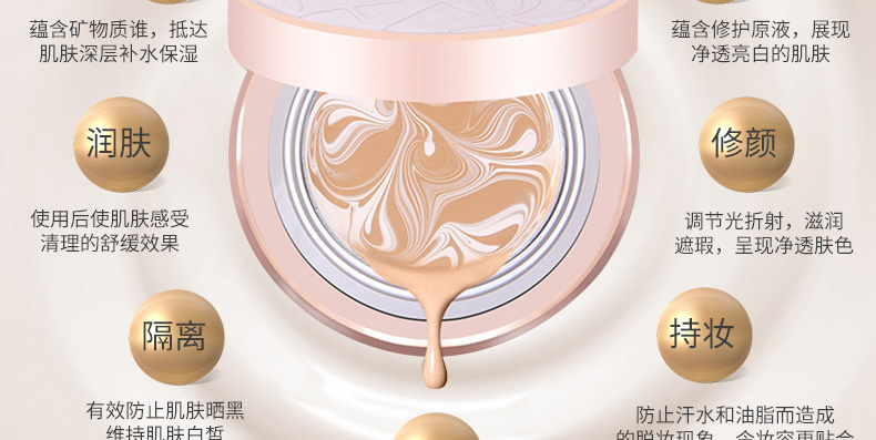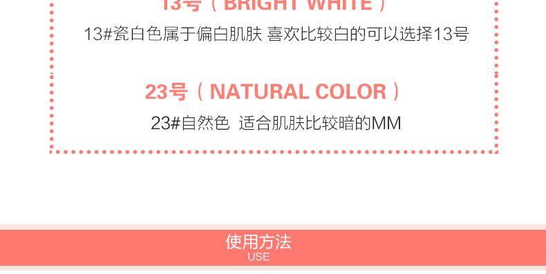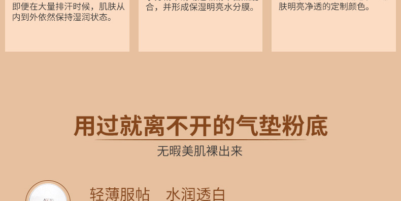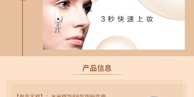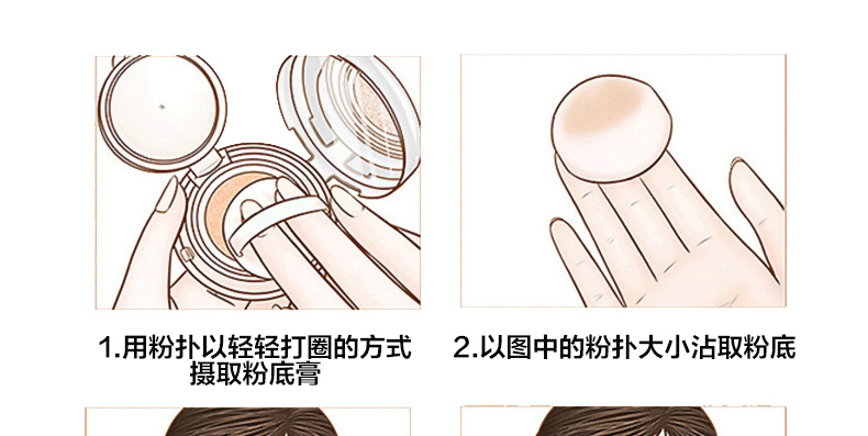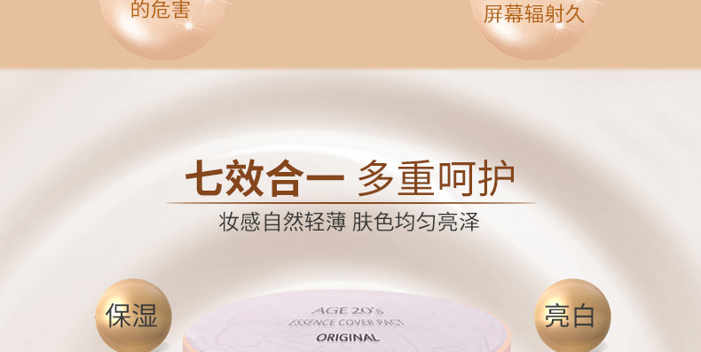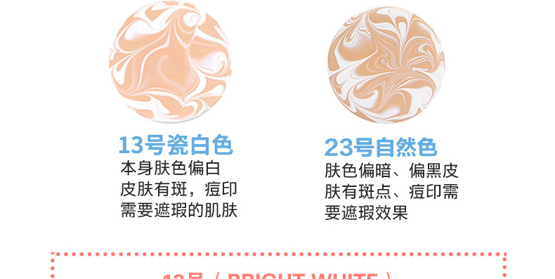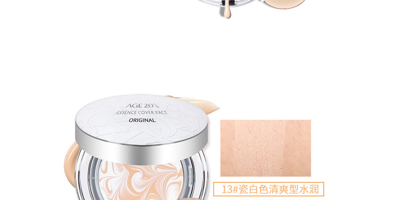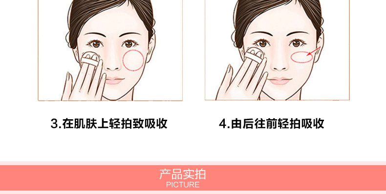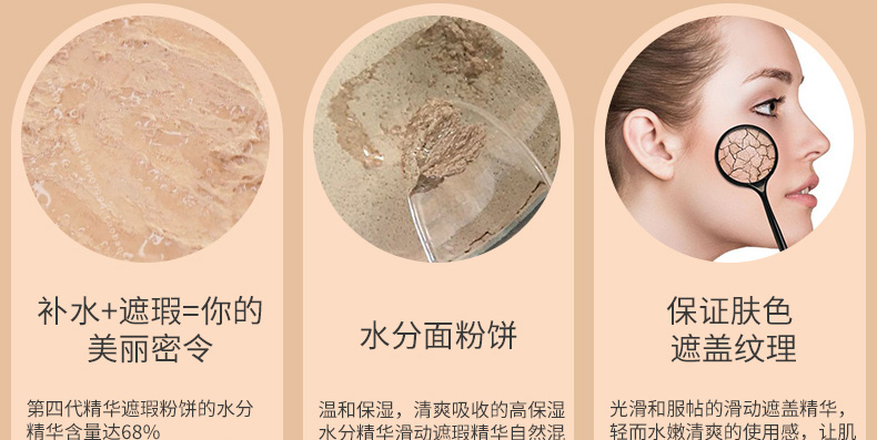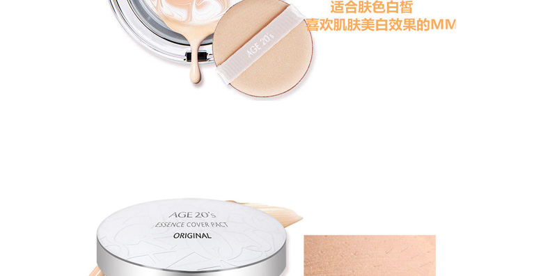 1、白色款的保濕遮瑕,持久滋潤。 2、相對粉色款,遮瑕效果好,適合臉上有輕微瑕疵,需要遮瑕的MM。 3、注意:不要用力按壓粉餅,這款不是氣墊粉,用粉撲在表面打圈,讓精華和粉底融合在一起,會有水珠出現。 |