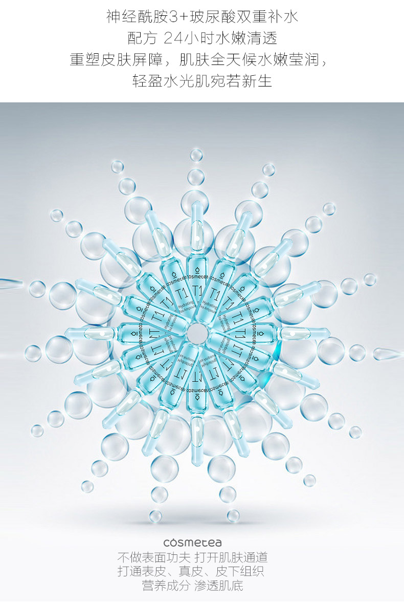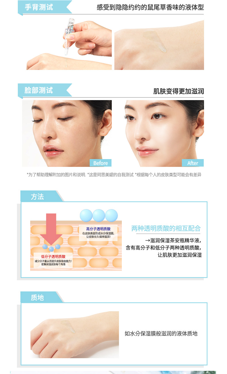 1、提高肌膚水含量,降低水分散失 2、調節誰有平衡,改善肌膚干燥引起的不適 3、能迅速提升肌膚水潤度和光澤度 |