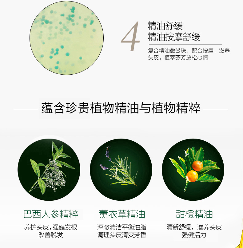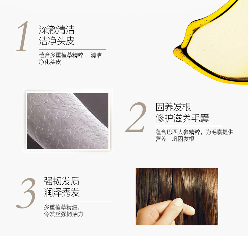 1、防脫去油,強健發根。 2、無硅油.不刺激.養頭皮 3、改善頭皮失調,刺激頭發生長,減少掉發,增進頭發光澤。 |