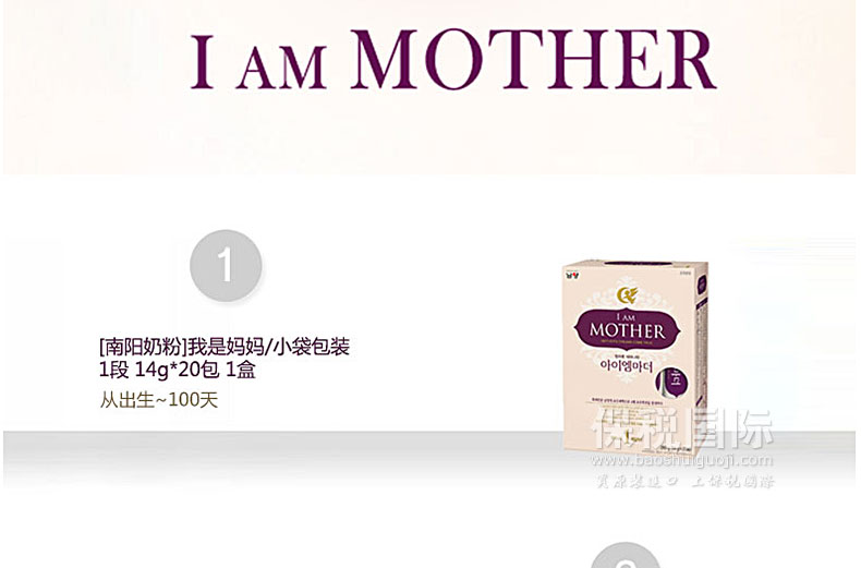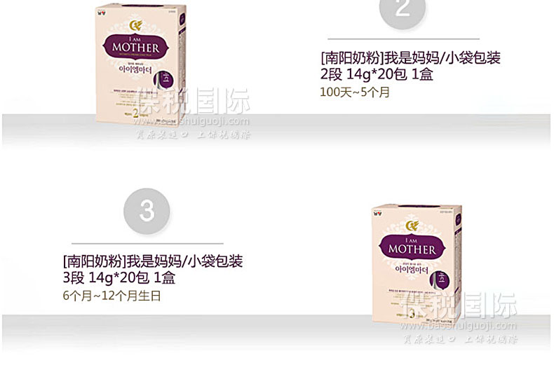 ![韓國直郵[南陽奶粉]我是媽媽/小袋包裝 3段 14g*20包 共3盒 適合6~12個月的寶寶](http://img.baoshuiguoji.com/image/c304ed76bf6c64bc38a5e76e1459eee6.jpg)