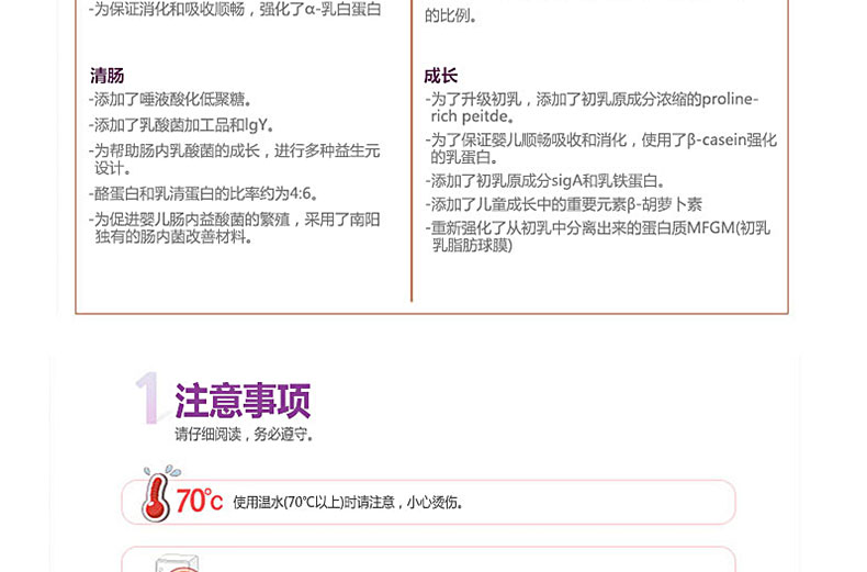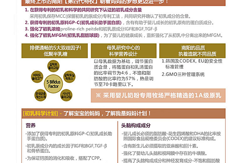 韓國直郵[南陽奶粉]我是媽媽/小袋包裝 4段 共3盒(14g*20包/盒) 適合1~2歲的寶寶—— ①含有免疫成分slga,成長因子IGF,促進細(xì)胞成長的EGF及TGF-β等可促進成長,提高免疫力。 ②南陽乳業(yè)特許成分GP-C(Growth Protein-Colostrum),能使成骨細(xì)胞機能活性化,增大牙骨細(xì)胞,有助于骨骼的形成和生長。 ③在韓國國內(nèi)唯一使用天然DHA愛恩斯坦原乳,有助于提高嬰兒大腦的發(fā)育。 ④適合出生1~2歲的寶寶 |