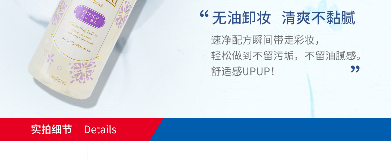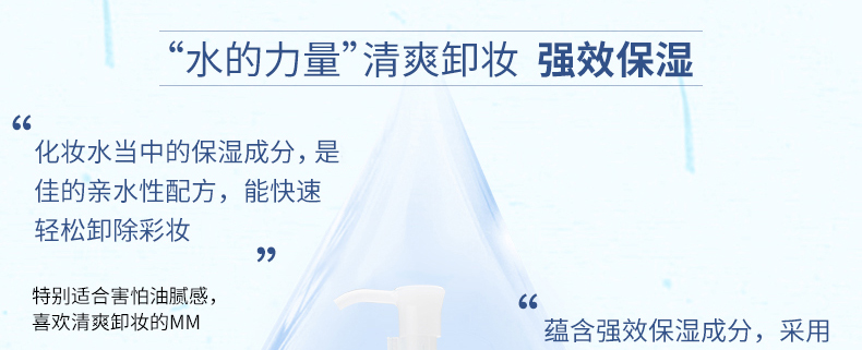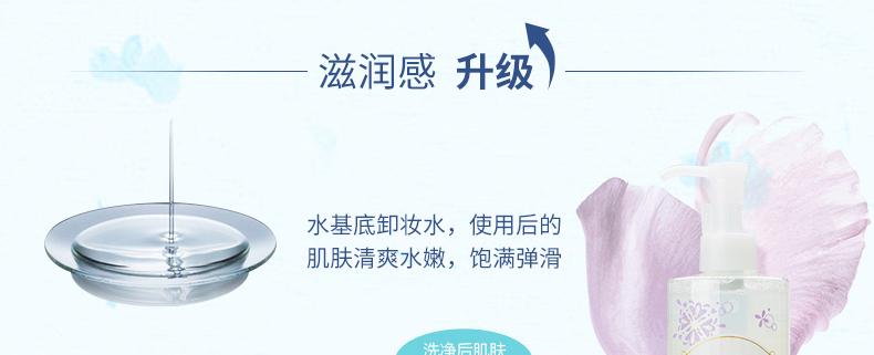 1、水潤潤,速凈不傷膚。 2、無油卸妝,清爽不黏膩。 3、彈力緊致,偏干肌膚適用。 |