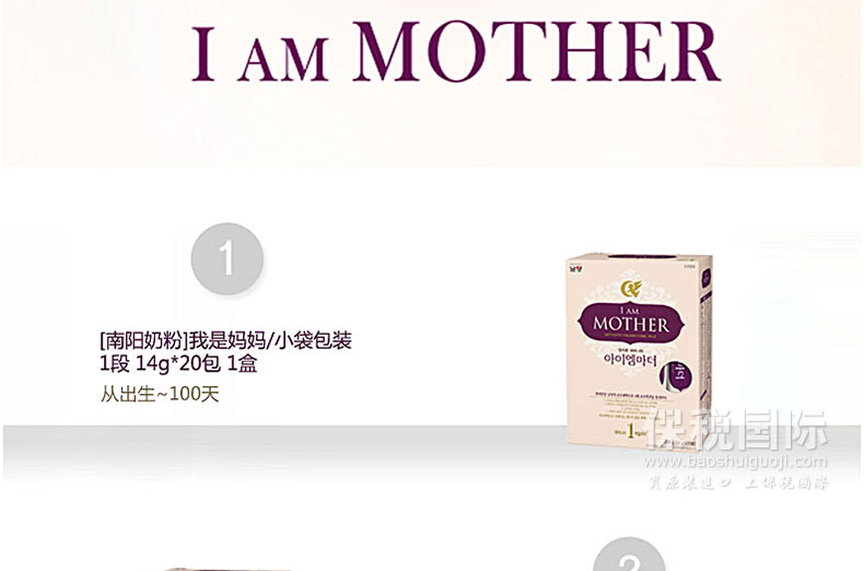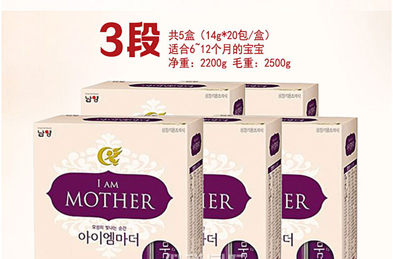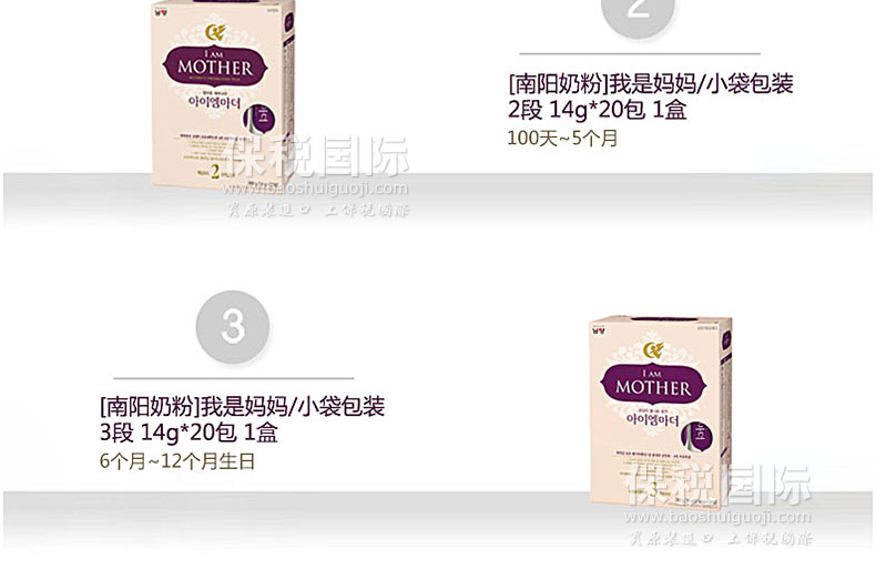 ![韓國直郵[南陽奶粉]我是媽媽/小袋包裝 2段 共5盒(14g*20包/盒) 適合100天~5個月大的寶寶](http://img.baoshuiguoji.com/image/fdf1d9cef055300e4afe06d922b8325e.jpg)
