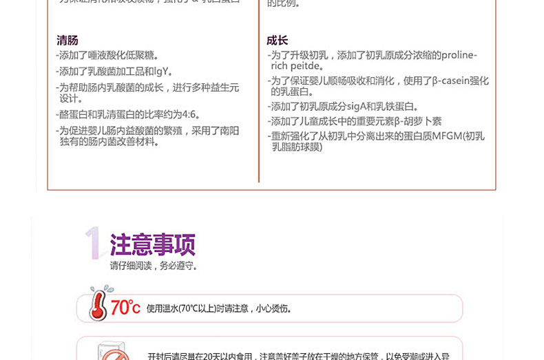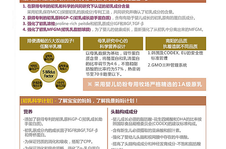 韓國直郵[南陽奶粉]我是媽媽/小袋包裝 2段 共5盒(14g*20包/盒) 適合100天~5個月大的寶寶—— ①含有免疫成分slga,成長因子IGF,促進細胞成長的EGF及TGF-β等可促進成長,提高免疫力。 ②南陽乳業特許成分GP-C(Growth Protein-Colostrum),能使成骨細胞機能活性化,增大牙骨細胞,有助于骨骼的形成和生長。 ③在韓國國內唯一使用天然DHA愛恩斯坦原乳,有助于提高嬰兒大腦的發育。 ④適合出生100天~5個月大的寶寶 |