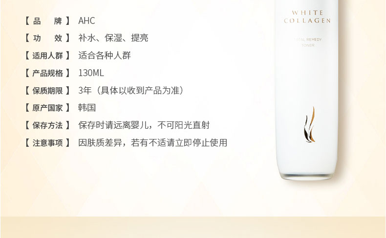 韓國AHC 臻白膠原蛋白補水保濕提亮美白修護緊致清爽柔膚水130ml |