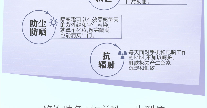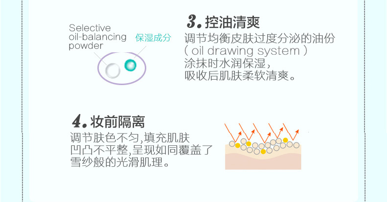 1、蘊含臻白修護(hù)復(fù)合物。 2、保濕控油,修飾膚色。 3、遮瑕,隔離彩妝。 |