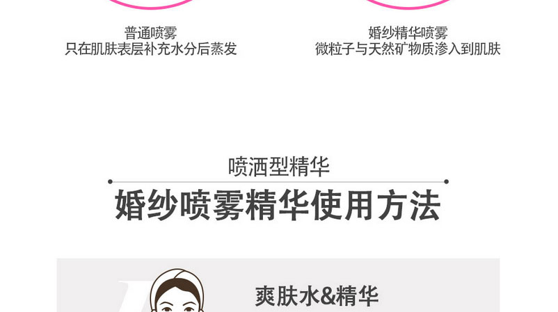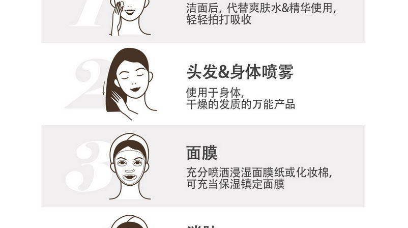 1、噴霧型水分精華。 2、保濕鎮定,收縮毛孔。3、油脂護理,提高皮膚抵抗力。 |