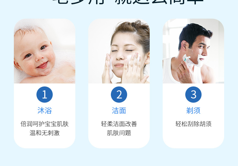 1、溫和不刺激。 2、保濕滋潤(rùn)嫩滑。 3、全身可用,全家適用。 |