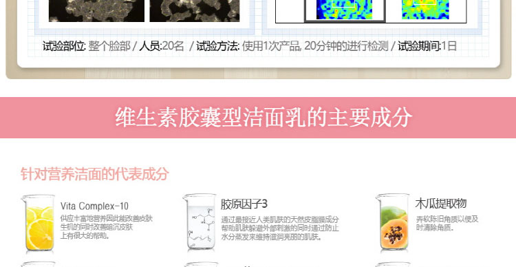 1、清除皮脂,改善毛孔狀態(tài)。 2、維生素護膚,煥活皮膚生機。 |