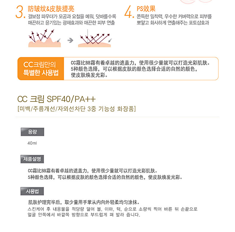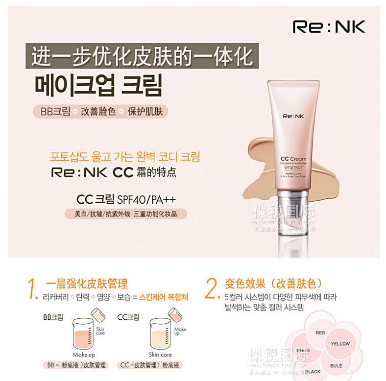 韓國Re:NK 遮瑕防曬CC霜SPF 40/PA++ 40ml—— 本品不僅可以解決基礎底妝問題(BB霜+改善面色+護膚),還具有肌膚護理+化妝+營養供給等功效,卓越的密著力,優秀的遮瑕功能,改善肌膚,強化對肌膚的護理,使肌膚散發自然美麗色彩。(再生+彈力+營養+保濕) 使用方法:基礎護理后,取適量本品分別涂在臉頰,額頭,下巴,然后用手指輕輕拍打直至涂抹均勻。 |