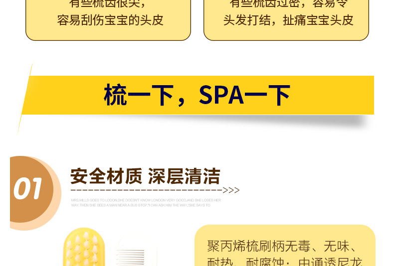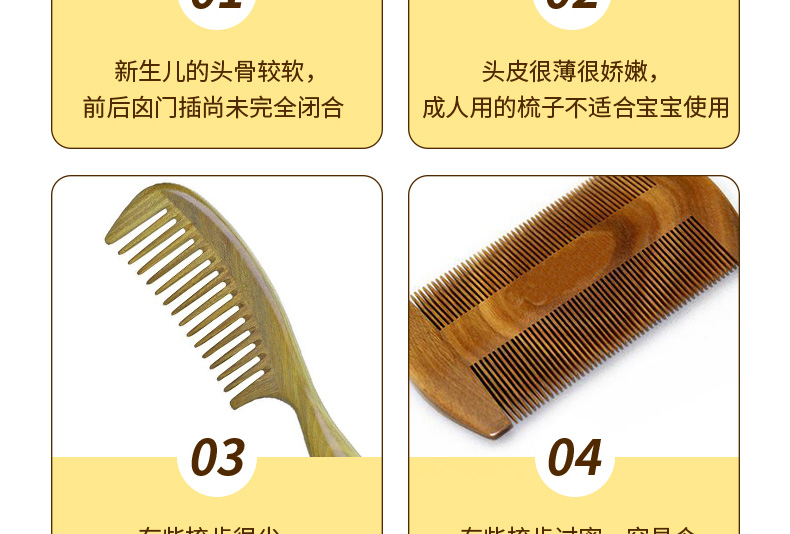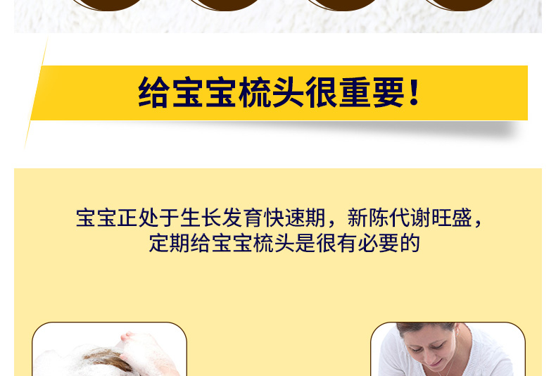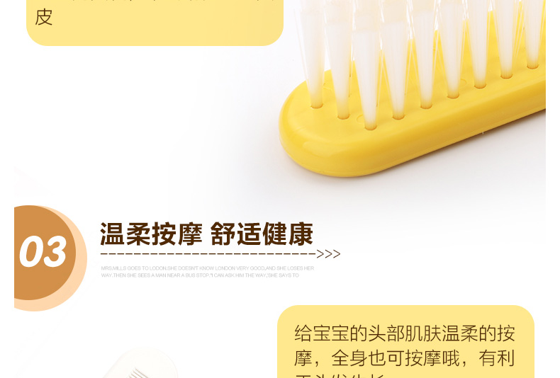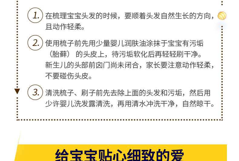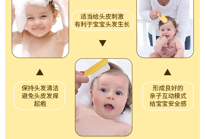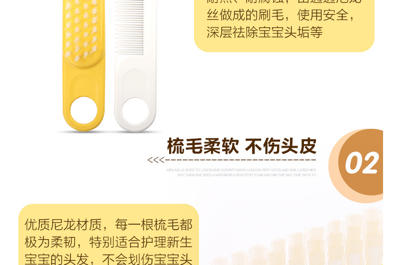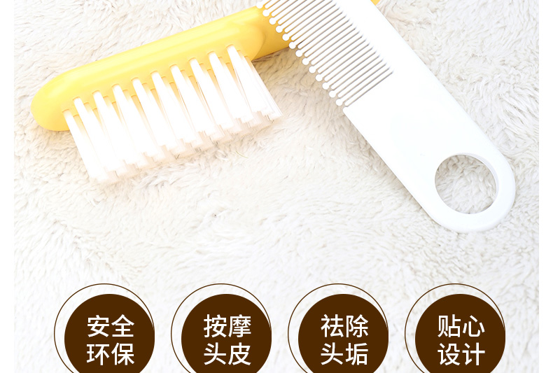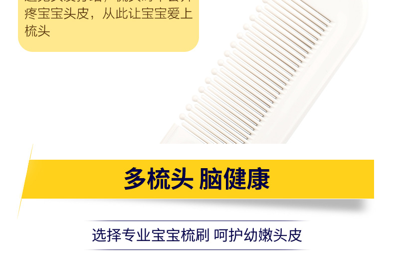 1、圓形梳子尖端,有效保護寶寶頭皮。 2、梳齒縫隙細(xì)密,更適合寶寶細(xì)弱的頭發(fā)。 3、軟毛毛刷,寶寶使用起來更加安全舒適。 |