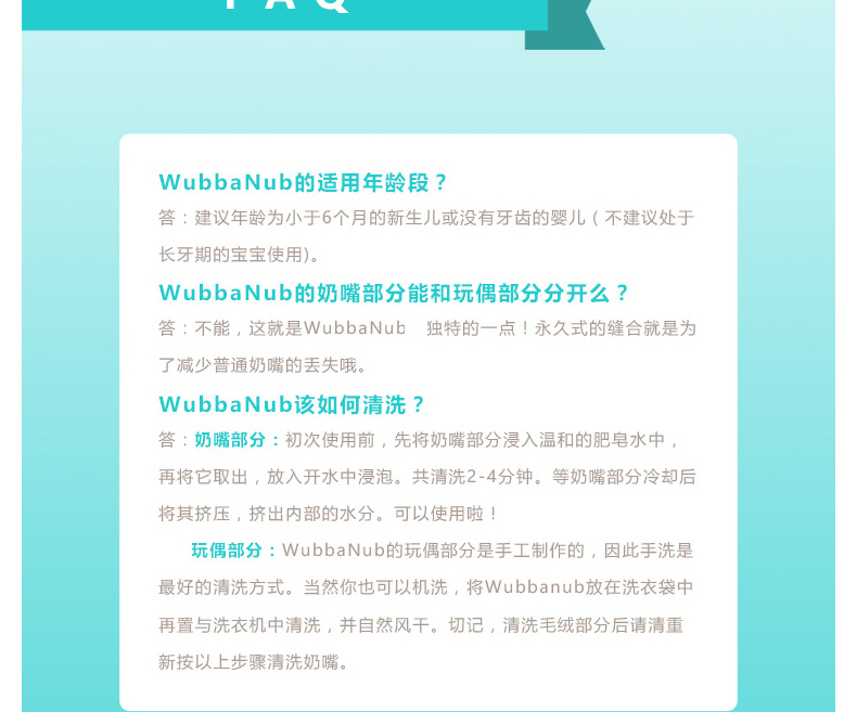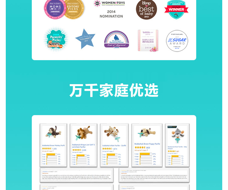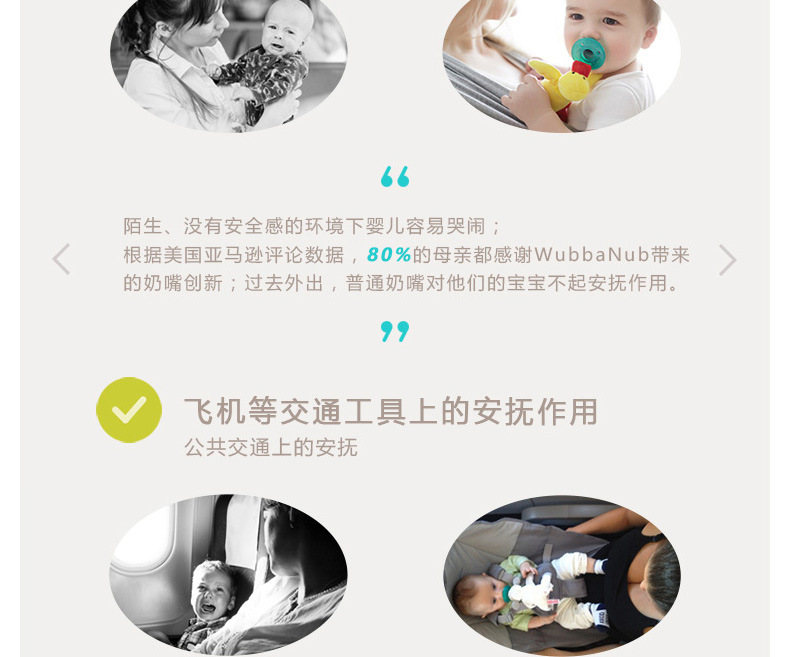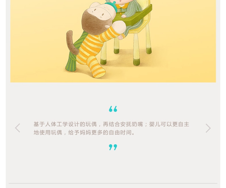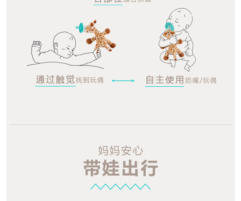 1、奶嘴安全無毒,柔軟耐嚼,不易斷裂。 2、毛絨玩具舒適好把握,使奶嘴更易接近寶寶嘴巴。 3、奶嘴和玩具相結(jié)合,防止奶嘴丟失。 |