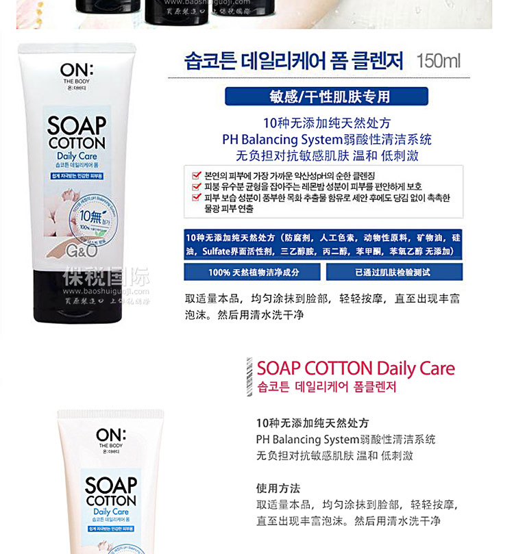 韓國LG ON:THE BODY 基礎護理泡沫洗面奶 150ml*2瓶—— 產品說明:最接近肌膚原本PH值得純天然弱酸性洗面奶。內部含有蜜蜂花成分,有效調節肌膚水油平衡。棉花提取物中含有豐富的肌膚保濕成分,潔面后,不會有緊繃感。10種無添加純天然處方,100% 天然植物潔凈成分 。 使用方法:取適量本品,均勻涂抹到臉部,輕輕按摩,直至出現豐富泡沫,然后用清水洗干凈。 |