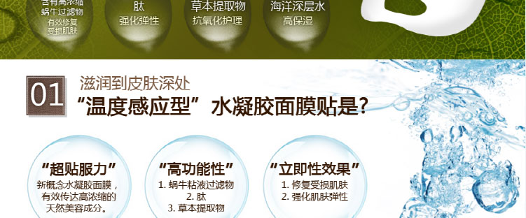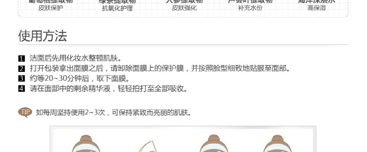 1、修復受損肌膚。 2、補水保濕,恢復肌膚彈性。 3、安全無刺激,敏感肌也可放心使用。 |