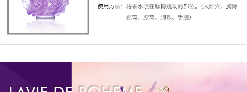 1、七點(diǎn)法:雙耳后側(cè)、后頸處、腰部左右兩側(cè)、左右手腕靜脈處、大腿內(nèi)側(cè)、左右腿膝蓋內(nèi)側(cè)、腳踝內(nèi)側(cè)。 2、噴霧法:讓香水距離身體約10-20公分,噴出霧狀香水,噴灑范圍越廣越好,隨后立于香霧中,讓香水均勻落于身上。 |