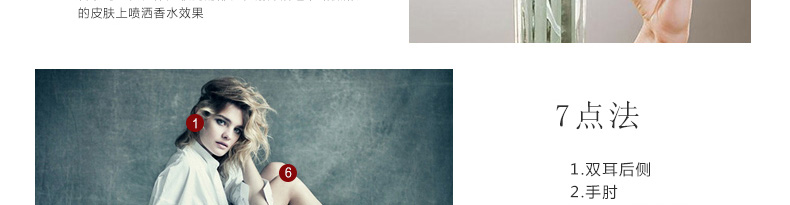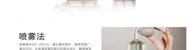 1、將香水噴在脈搏跳動的部位。 2、也可采用噴霧法,讓香水均勻的灑落在身體上,留下持久淡淡的香氛。 |