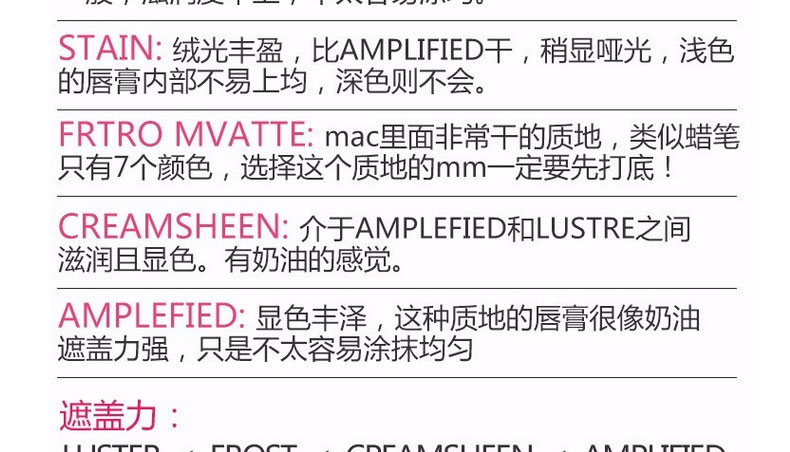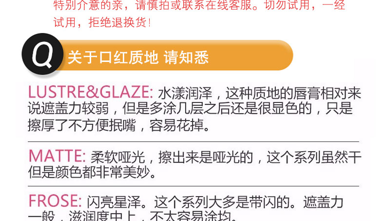 1、高度顯色、色澤飽滿,輕盈無負擔。 2、滋潤保濕,淡化唇紋。 3、單涂打造飽滿美唇,更可雙色疊涂,混搭出創意漸變唇。 |