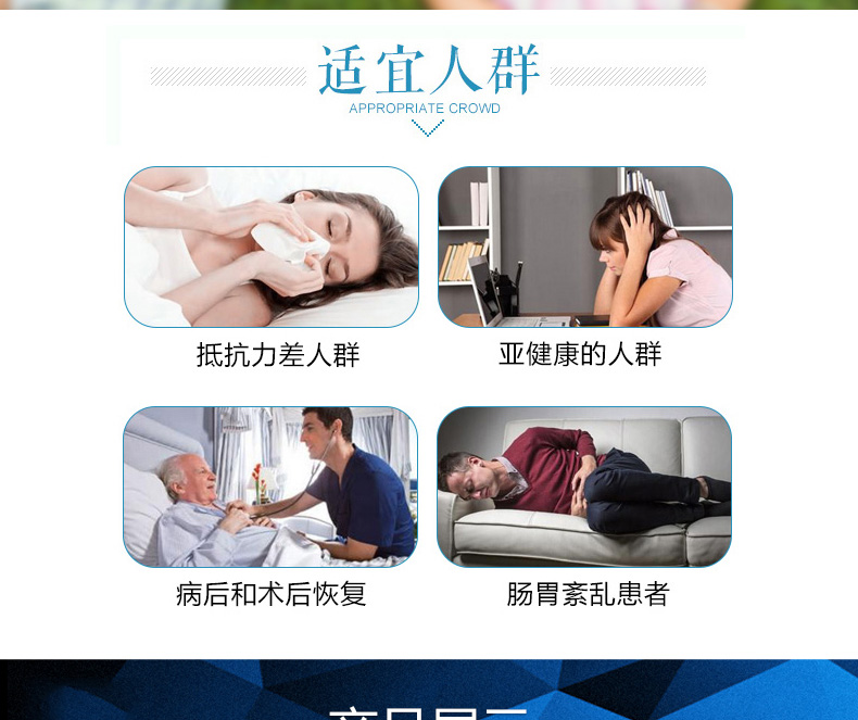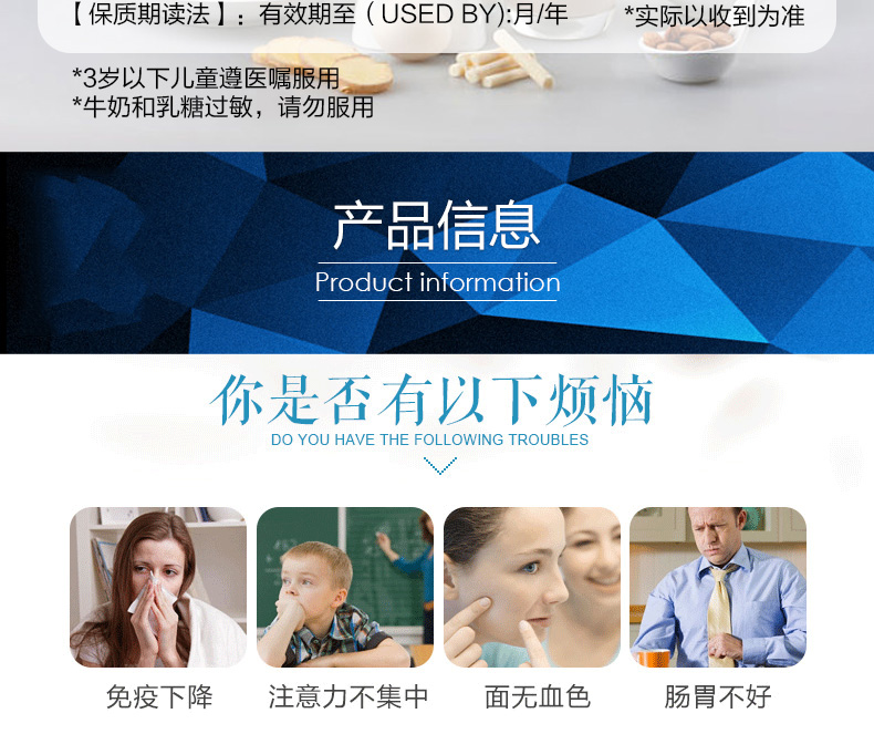 1、提升免疫力預防感冒。 2、高濃度鈣低糖低脂。 3、調理腸胃益生菌群。 4、緩解疲勞延緩衰老。 |