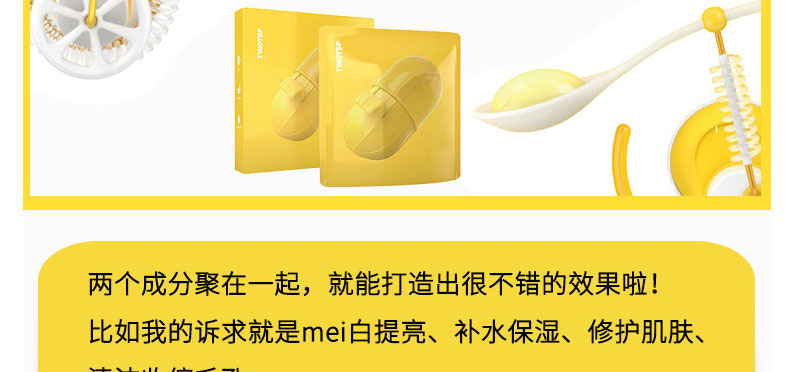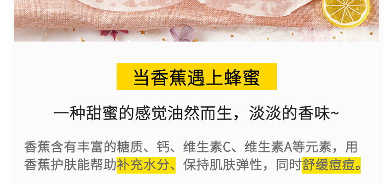1、蜂蜜和香蕉中的天然成分提取物,不僅補(bǔ)充肌膚水分還可以提亮膚色。 2、全新材質(zhì)的面膜紙高度服帖并牢牢鎖住精華。 3、高度保濕功效的玻尿酸鈉精華,為干燥的肌膚注入充足的水分。 |