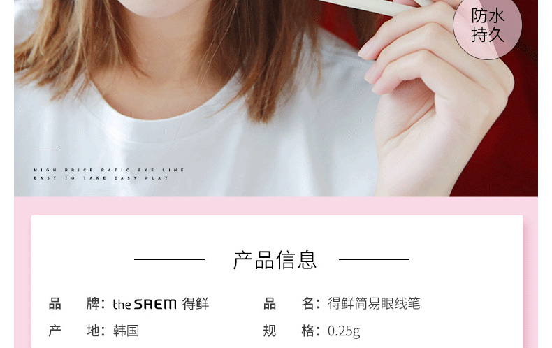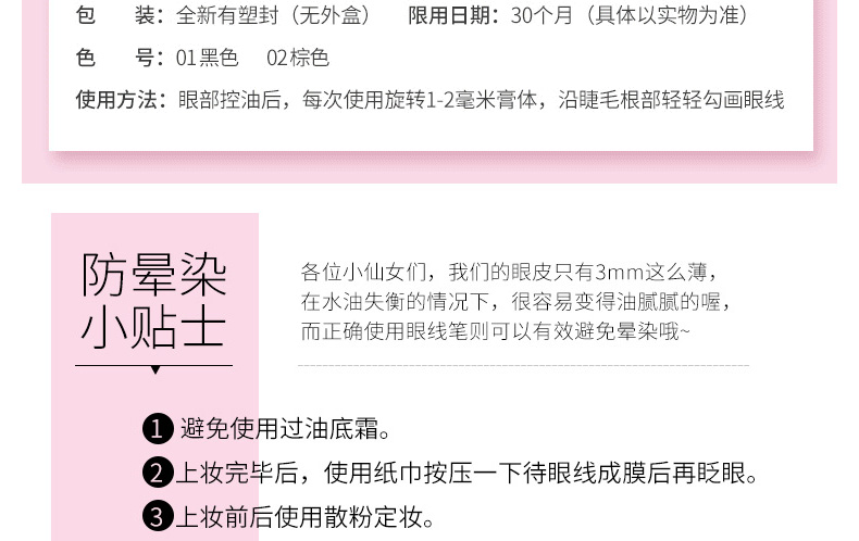 這款眼線筆長時間防水防汗不暈染,并且防油效果也很不錯,但是如果肌膚非常油的MM,建議使用前先用蜜粉打底。 |