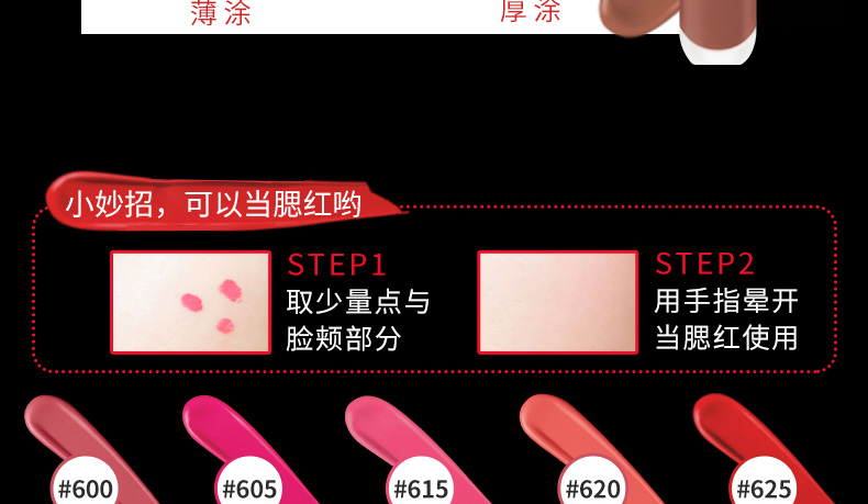 因為霧面質地本來就感覺容易干,所以涂的時候不要沾太多。喜歡自然感多一點的,記得把唇刷在邊緣刮兩下不要反復涂抹,否則新抹的會把舊抹的顏色帶走導致涂得不均勻。 |