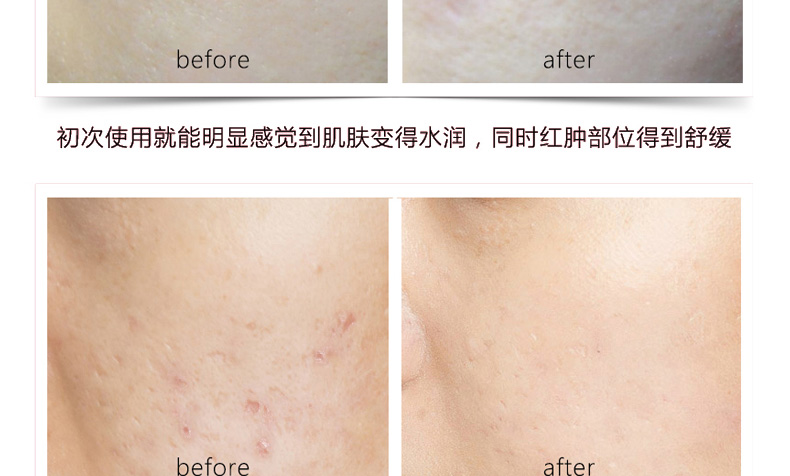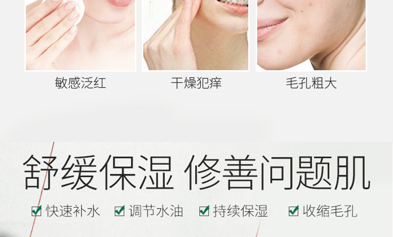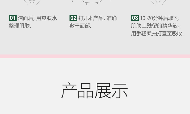 1.幫助舒緩被外部環境刺激的肌膚,深層補水,淡化痘痕。 2.含有大量精華液,舒緩敏感肌膚。 3.快速補水,調節肌膚水油平衡,提高肌膚免疫力。 |