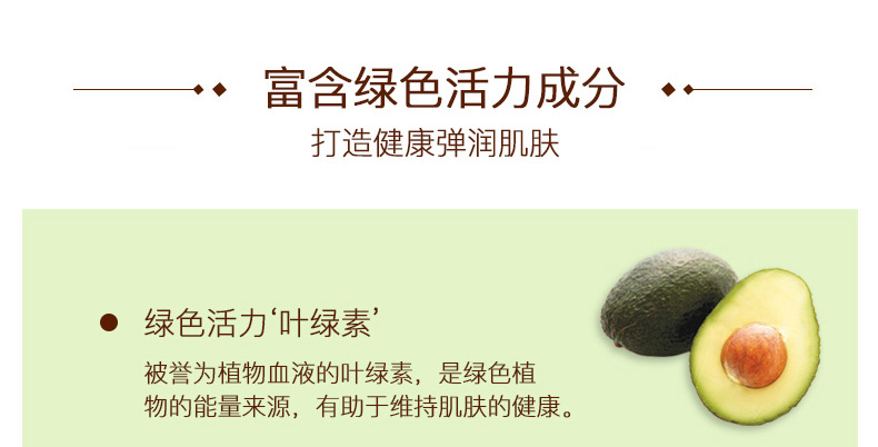 1.富含綠色活力成分,打造健康彈潤肌膚。 2.改善暗黃無彈肌膚膚質,肌膚長效保濕滋潤,緊致彈潤。 3.牛油果這個系列屬于滋養型,比較適合干性肌膚和中性肌膚,也適合敏感肌和孕婦。 |