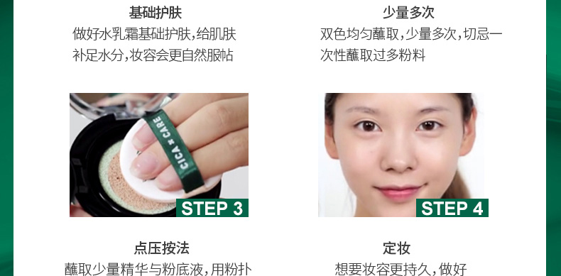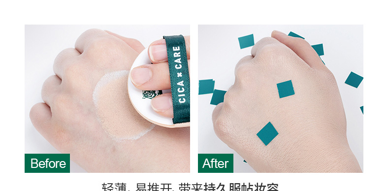 1.粉撲是VT特有的年糕粉撲,很柔軟,不吃粉,上妝服帖,適合多種肌膚使用。 2.含有積雪草提取精華,內芯外面的綠色圈圈是護膚精華成分。 3.氣墊輕薄透氣不厚重,鎮定舒緩肌膚不悶痘,幫助輕松打造無暇肌膚。 |