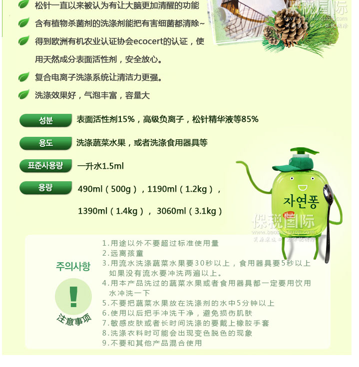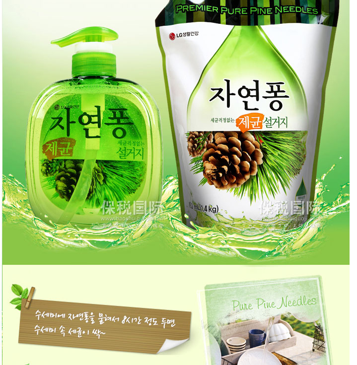 韓國LG竹鹽天然寶瓶裝洗滌劑/洗潔精(松針清香) 500g*2—— 適用范圍: 1.可用于洗滌蔬菜、水果、碗筷等各種食用器皿及各種廚房炊具 2.把洗碗布放在足量的洗潔精原液中浸泡(洗碗布較薄時,洗潔精不得少于3ml,較厚時,洗潔精不得少于8ml),浸泡時間不得少于8小時。 注:本產品無法去除所有種類的細菌。冬季室內常溫下保存。 |
