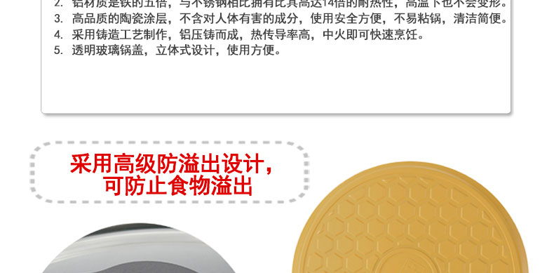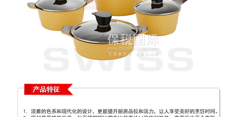SWISS MILITARY LAVEUX 韓國原裝進口鋁制材質 陶瓷涂層 現代化淡雅 陶瓷鍋 4件套—— 1.淡雅的色系和現代化的設計,更能提升廚房品位和活力,讓人享受美好的烹飪時間。 2.鋁材質是鐵的五倍,與不銹鋼相比擁有比其高達14倍的耐熱性,高溫下也不會變形。 3. 高品質的陶瓷涂層,不含對人體有害的成分,使用安全方便,不易粘鍋,清潔簡便。 4.采用鑄造工藝制作,鋁壓鑄而成,熱傳導率高,中火即可快速烹飪。 |