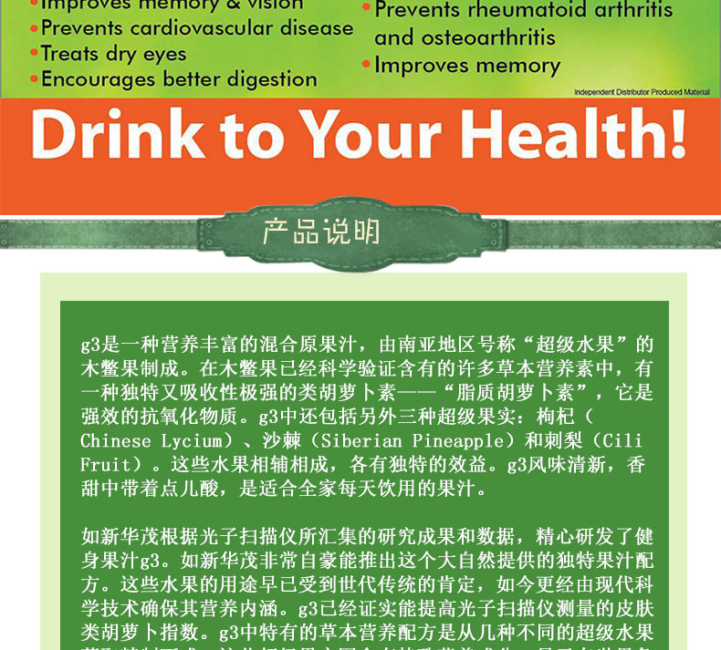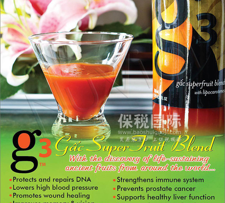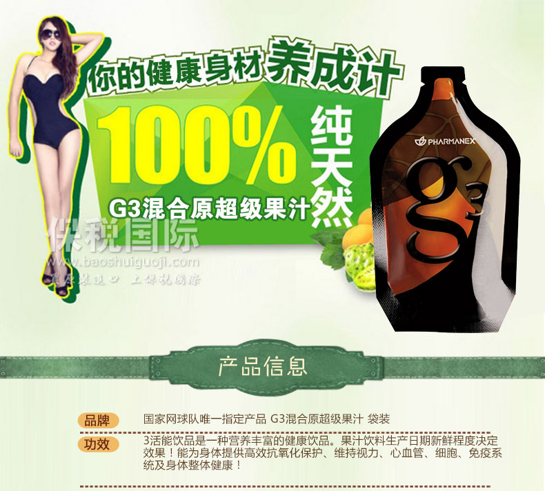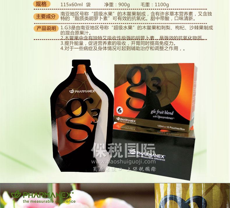 | 產品說明 | Nuskin美國華茂 國家網球隊唯一指定產品 G3混合原超級果汁 袋裝—— 1.G3是由南亞地區號稱“超級水果”的木鱉果和刺梨、枸杞、沙棘果制成的混合原果汁。 2.木鱉果中含有獨特又吸收性極強的胡蘿卜素,是強效的抗氧化物質。 3.提升能量,促進營養素的吸收,開胃同時提高免疫力。 4.對于一些病癥及身體情況可起到輔助治療和調整之作用,。 5.美國、臺灣奧委會、中國國家網球隊為運動員唯一指定產品。 | |||