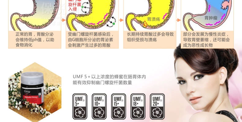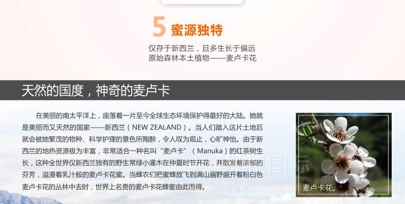 新西蘭 COMVITA/康維他 Manuka Honey 5+麥盧卡蜂蜜5+ 500g—— 1.康維他活性麥盧卡蜂蜜經過特殊測試和包裝保證每瓶蜂蜜的抗菌作用大于標準的抗菌劑。 2.康維他活性麥盧卡蜂蜜盛裝在一種不易破裂的褐色容器內保護蜂蜜中的重要天然成分不受光線的損壞. 3.康維他活性麥盧卡蜂蜜是一種純粹的天然"生"蜜產品富含所有的天然酵素和花蜜. |