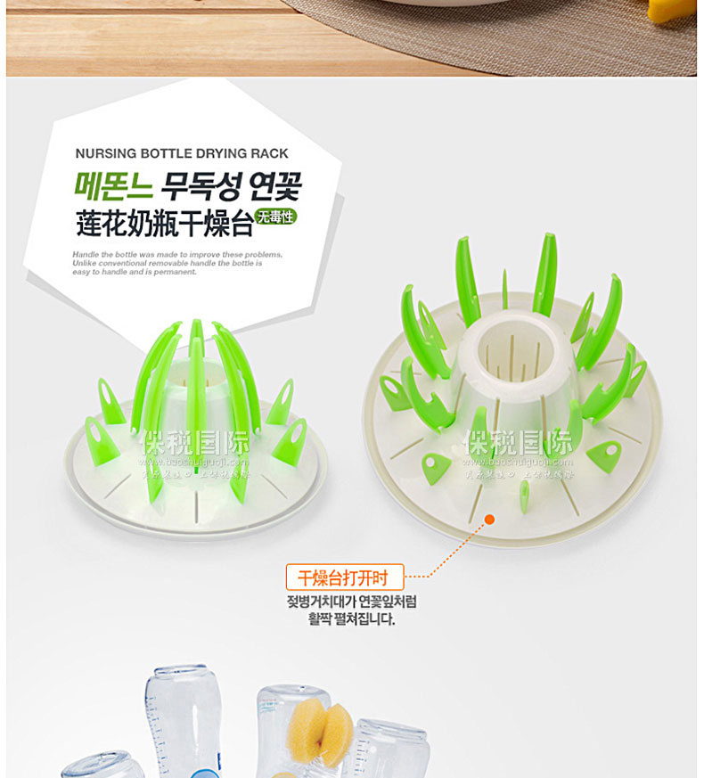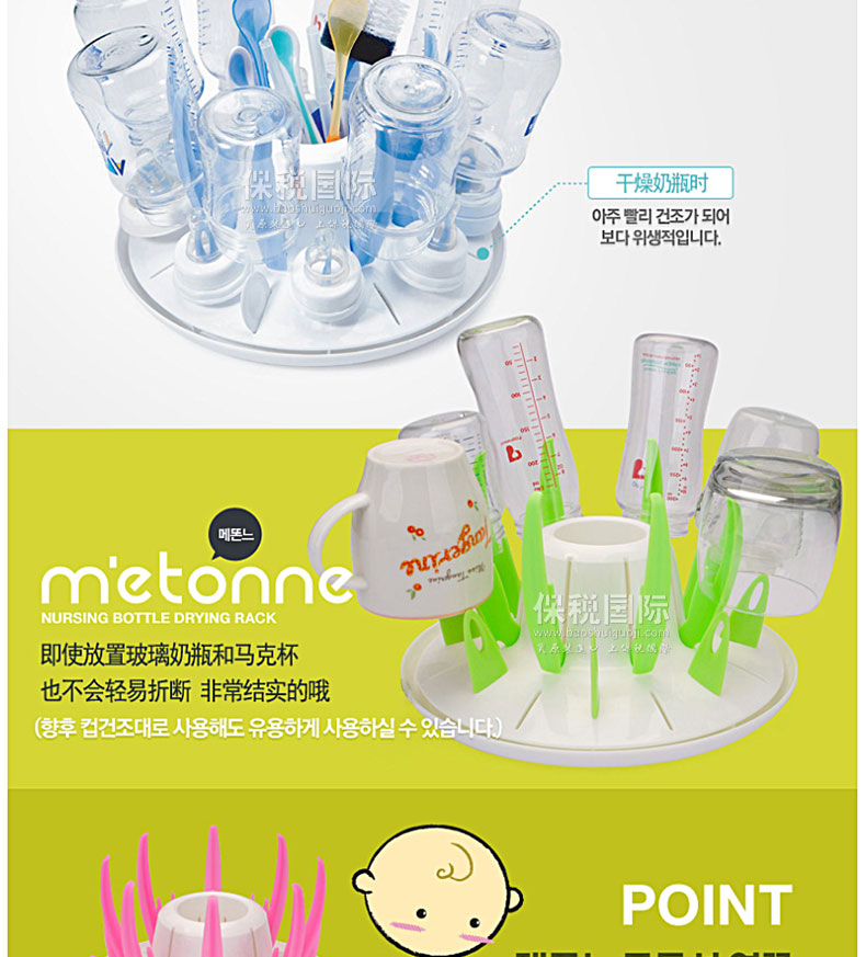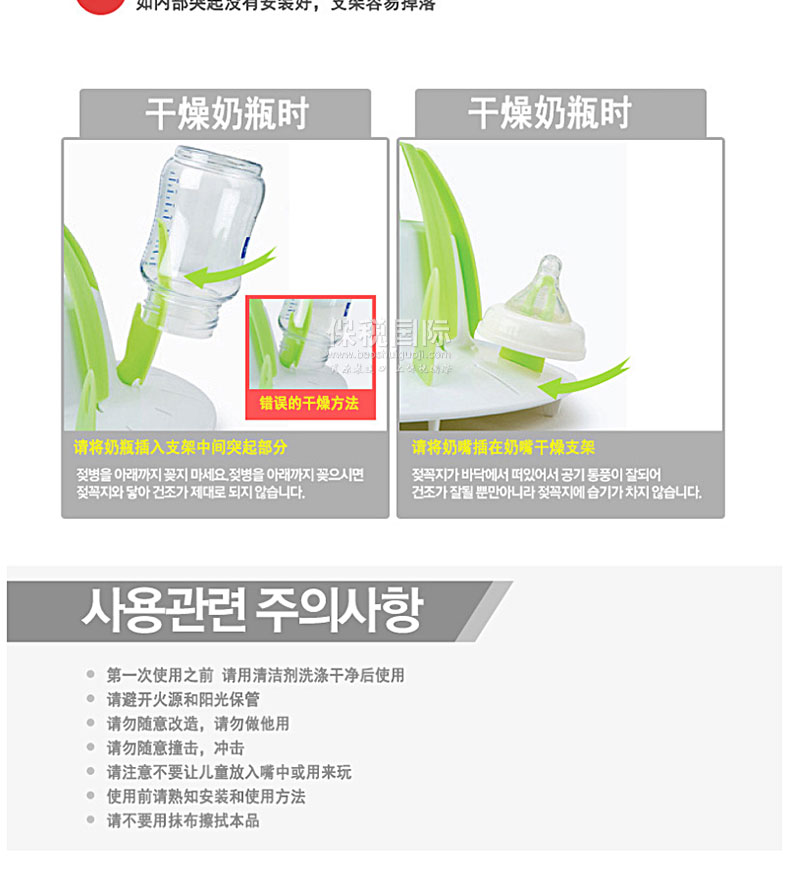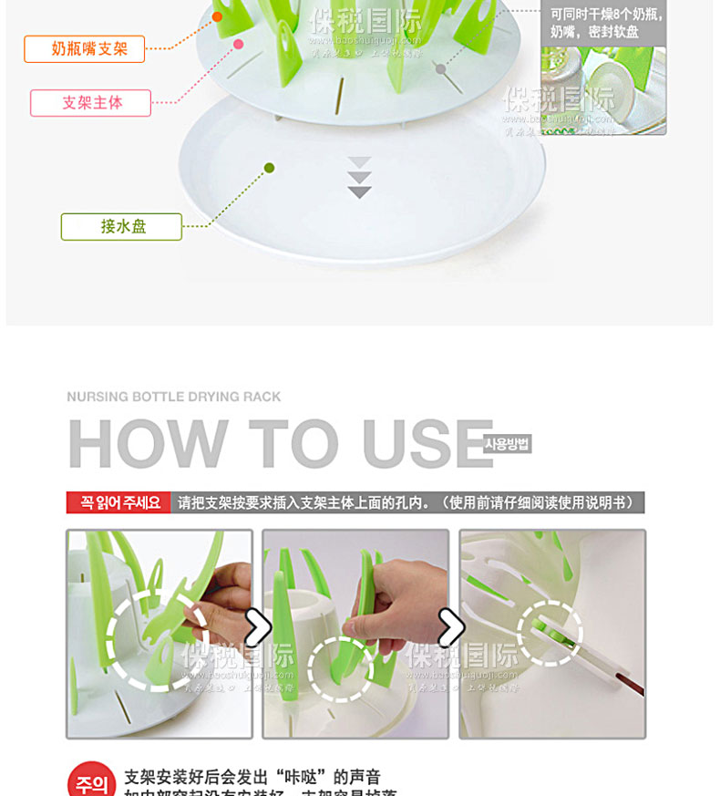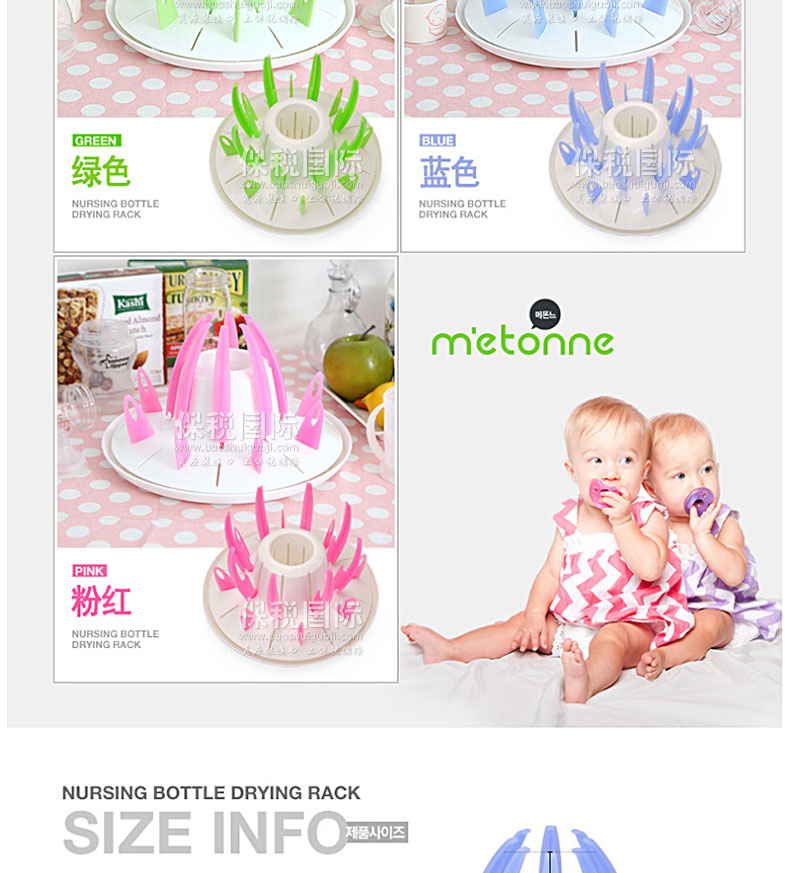 韓國(guó)M'etonne花式嬰兒用品奶瓶晾干架/整理架/晾曬架/收納架(藍(lán)色)—— 可以用于所有型號(hào)的奶瓶,杯子,奶嘴,環(huán),吸管,奶瓶墊,奶瓶蓋甚至是大的奶瓶刷,可以把晾干架放置在任何地方。把架子放在蓄水盤(pán)上,并保持干燥,一個(gè)方便收藏干燥的架子,讓您寶寶的食物器皿遠(yuǎn)離櫥柜。 使用方法:把奶瓶干燥架放在平整的臺(tái)面或桌子上。要將奶瓶,奶嘴和其他物品分別含洗潔精的熱水里面清洗,將物品放在固定的奶瓶架上風(fēng)干。干了之后,將所有奶瓶及其他物品收起來(lái),并把蓄水盤(pán)中的水倒掉。 清洗:每次用過(guò)之后在含洗潔精的熱水里面清洗,并沖洗干凈。或 者在洗碗機(jī)的頂層架子上清洗,可以風(fēng)干。 溫馨提示:此產(chǎn)品不是玩具,僅供成人使用。圖中的奶瓶和其他物品不包括在內(nèi)。 |