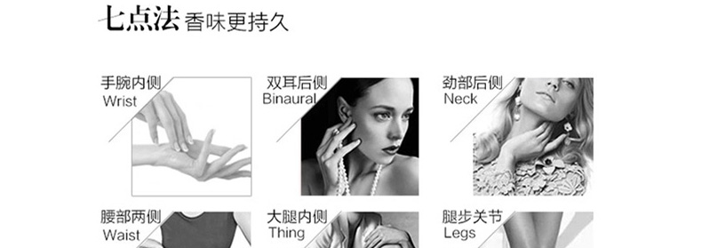 1.香水的香味較濃時,應該使用在冬天、盛裝或者宴會上。 2.香水的香味較淡時,應該使用在夏天或者白天上班時。 3.噴香水時,噴口應該于身體保持30公分的距離,這樣才可使香水的香味均勻分布,而不會集中在某處。 |