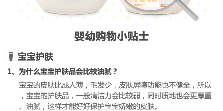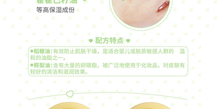 柔軟肌膚保濕潤澤。蘊含鱷梨油、霍霍巴油等高保濕成分,令寶寶嬌嫩肌膚柔軟滋潤,觸感清爽不油膩,與皮膚具有良好的親和性。 |