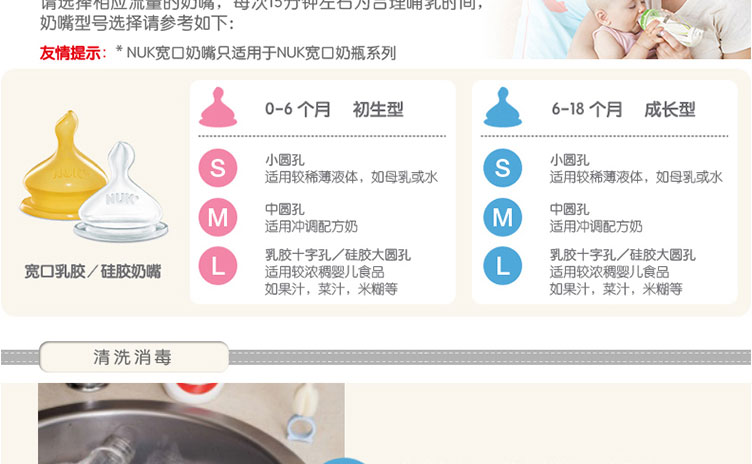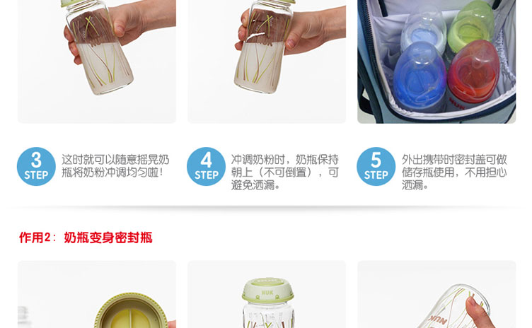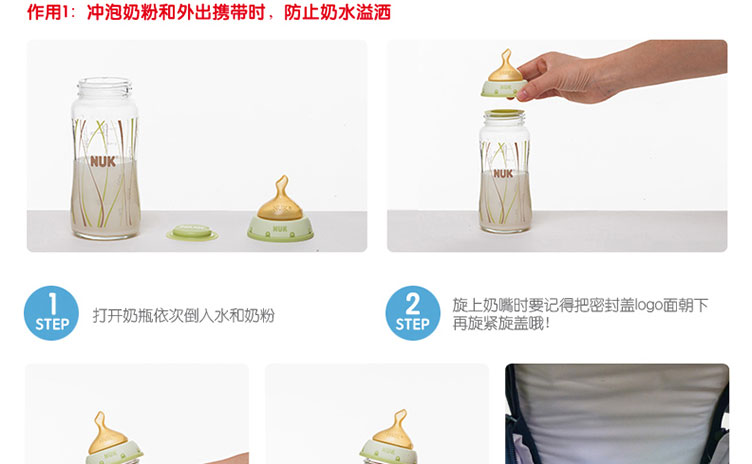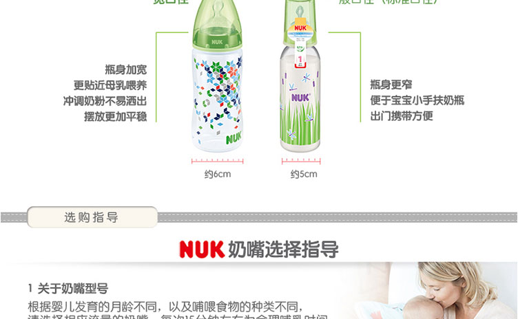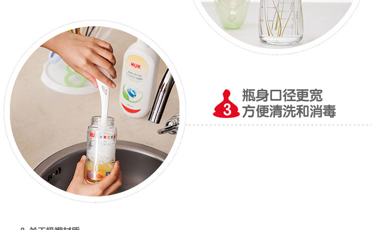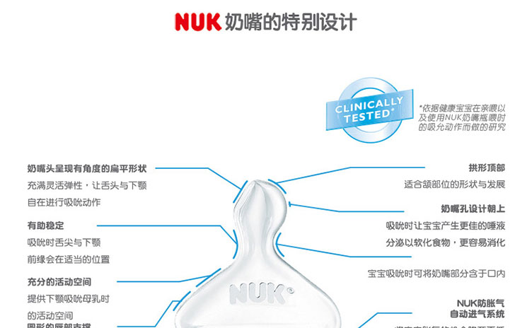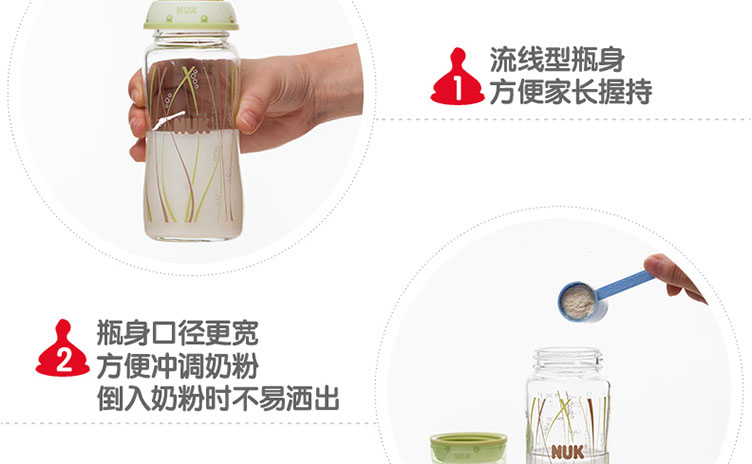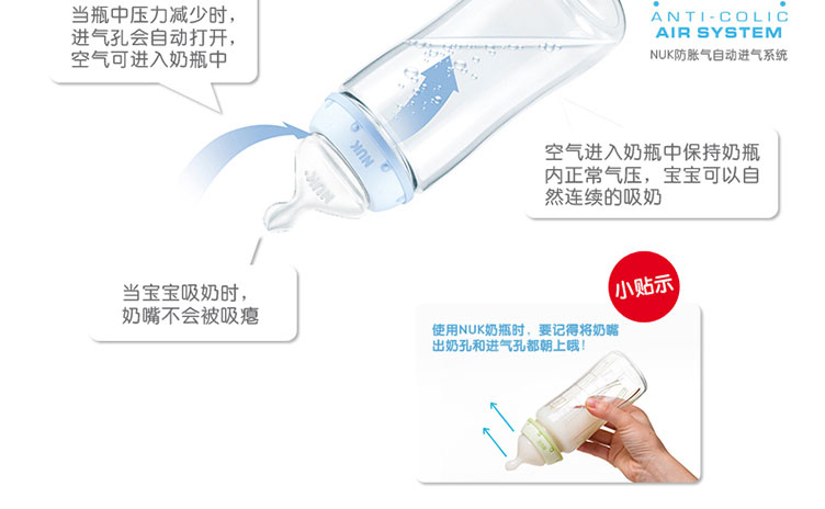 1.防脹氣自動進氣系統(tǒng)。 2.拇指奶嘴設計,寶寶吸允舒暢。 3.寬口徑設計,沖奶時奶粉不易灑,清洗方便。 |