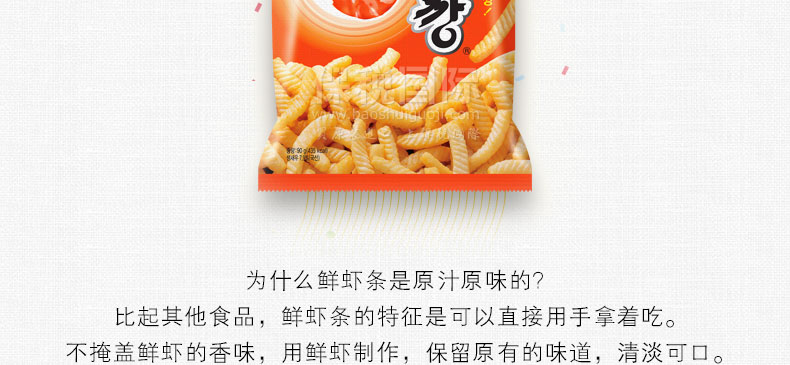 韓國(guó)進(jìn)口零食 農(nóng)心鮮蝦條 原味 休閑零食 400g—— 1 選用新鮮蝦為主要原料,保留原有口味 2 無(wú)添加劑 防腐劑 和色素 3 陰涼干燥處保存 |