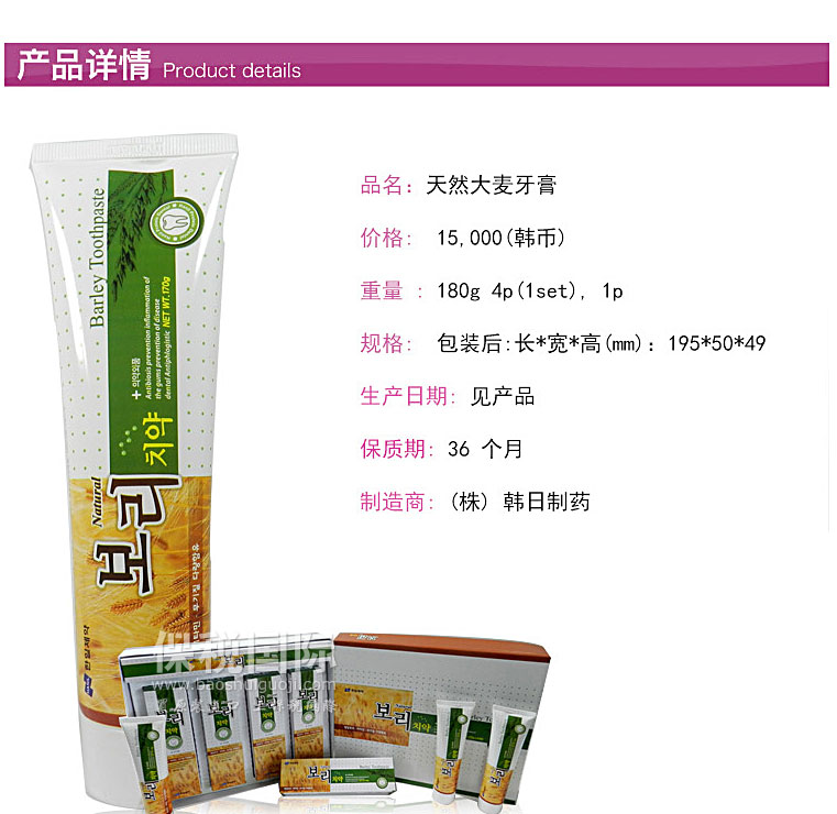 商品名稱 | 韓國韓日制藥HANIL天然大麥功效型牙膏 180g | ||