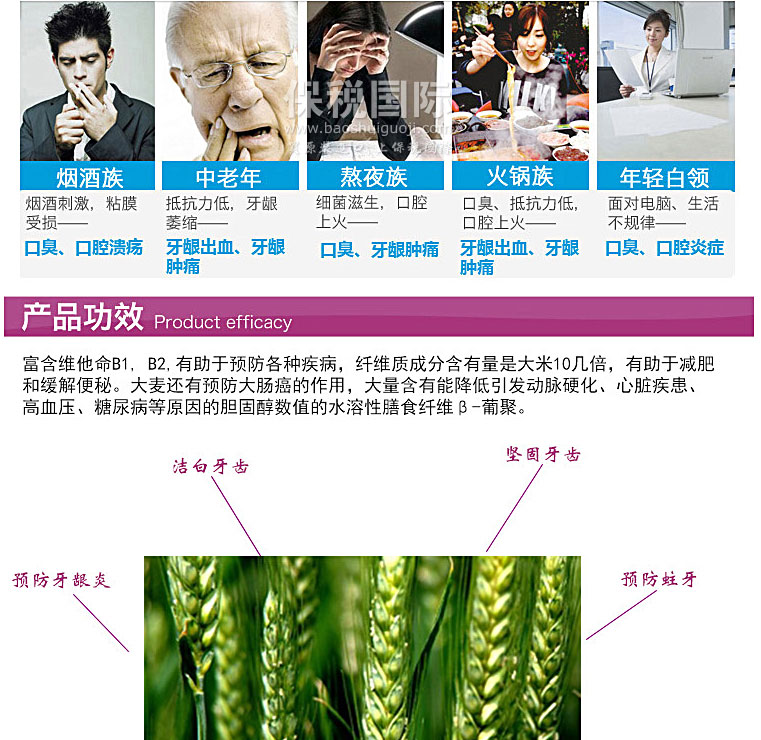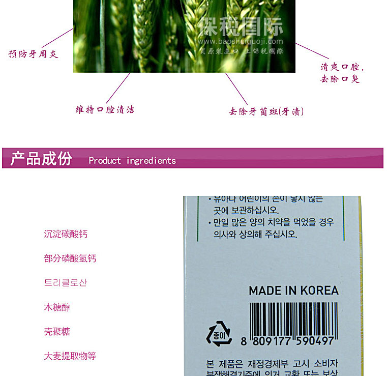 韓國韓日制藥HANIL天然大麥功效型牙膏 180g—— 大麥富含維他命B1, B2,有助于預防各種疾病,纖維質成分含有量是大米10幾倍,有助于減肥和緩解便秘。大麥還有預防大腸癌的作用,大量含有能降低引發動脈硬化、心臟疾患、高血壓、糖尿病等原因的膽固醇數值的水溶性膳食纖維β-葡聚。 |