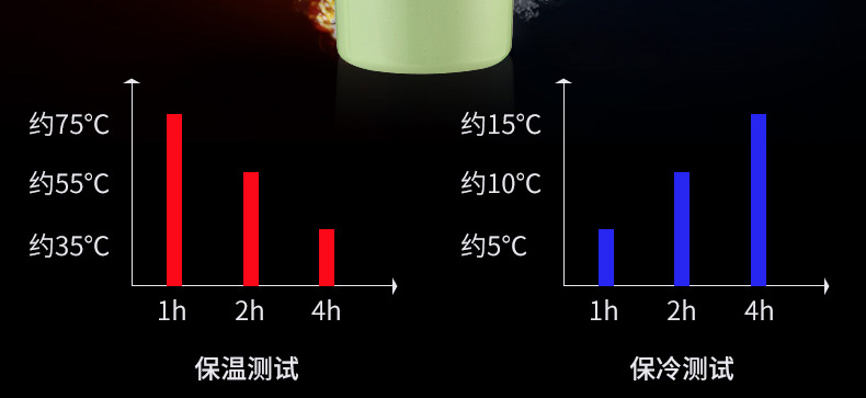 1.室溫22℃時,裝滿95℃開水4小時后水杯內溫度約為35℃以上。 2.室溫22℃時,裝滿0℃冰水4小時后水杯內溫度約為15℃以上。 3.因杯內熱水與外在空氣氣壓的關系,開蓋前或者蓋上杯蓋前,都需要先把密封孔打開。 4.廣口杯型易清洗。 |
