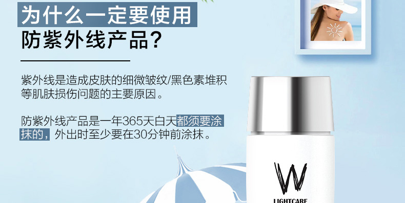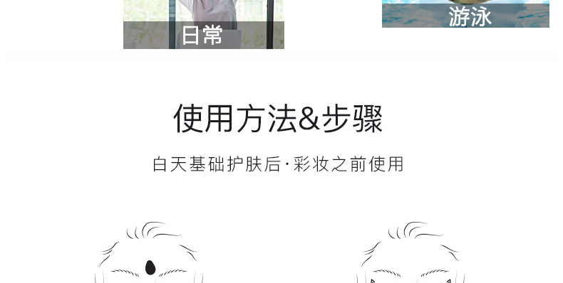 1.高倍防曬 2.水潤保濕 3.水油平衡 4.鎮定肌膚 |