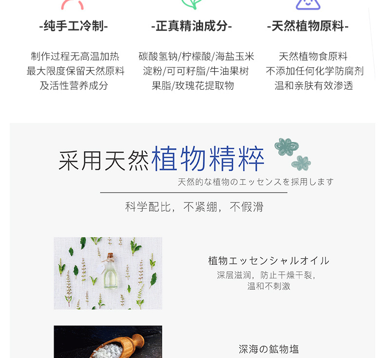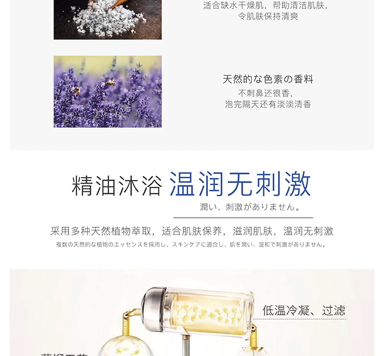 1.精油沐浴,溫潤無刺激。 2.天然食用級原料,真正精油成分,不含防腐劑和香精。 3.滋潤保濕,還你嬌嫩肌膚。 |