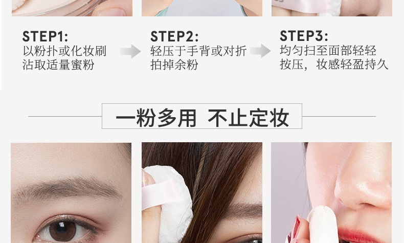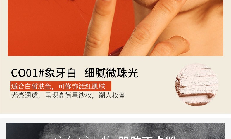 1.透明色,自然啞光,不挑膚色,不破壞底妝,宛若薄紗拂面,打造日常通勤霧面妝。 2.象牙白,細(xì)膩微珠光,適合白皙膚色,可修飾泛紅肌膚,光亮通透,呈現(xiàn)高街星沙妝,潮人必備。 3.自然色,自然啞光,適合大眾膚色及偏黃皮,肌膚自帶柔光濾鏡,輕松打造自然約會(huì)妝。 |