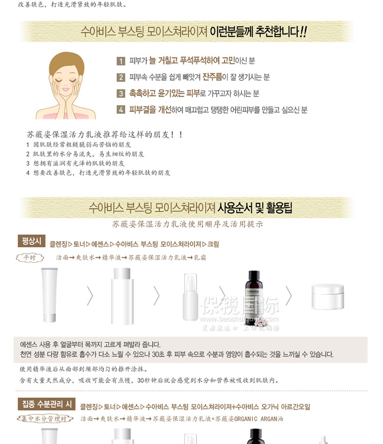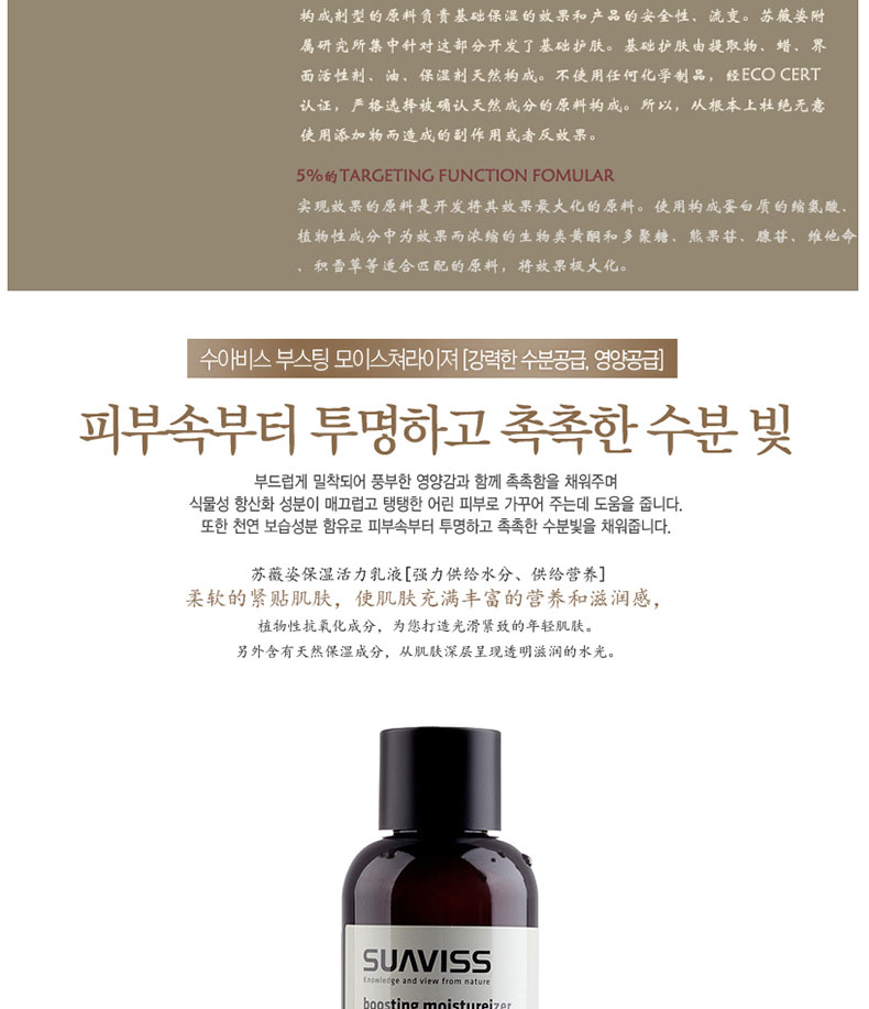 韓國SUAVISS/蘇薇姿保濕活力乳液 170ml—— 迅速給饑渴的肌膚供給水分,給您帶來健康明亮肌膚。柔軟緊貼肌膚,使肌膚充滿豐富的營養和滋潤感的干性肌膚專用潤膚乳液。植物性抗氧化成分,促進肌膚改善,形成肌膚保護墻壁,在各種有害環境和干燥環境中保護肌膚。 |