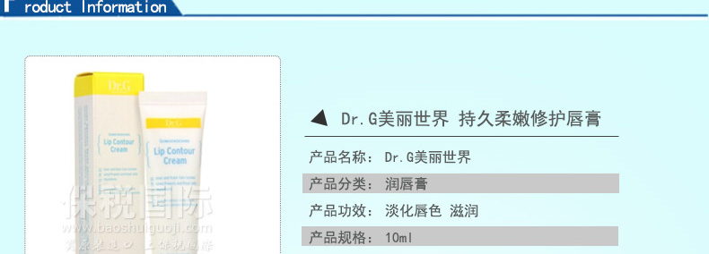 DR.G 美麗世界 SPECIAL CARE 持久柔嫩修護唇膏 滋潤保濕 (10ml)—— 1.質地柔滑細致,同時提供保濕、愈合及抗氧化三大功效。 2.能增強雙唇的天然水份保護層,讓唇紋瞬間減退。 3.用后使干燥脆弱的唇部,恢復柔軟濕潤。 |