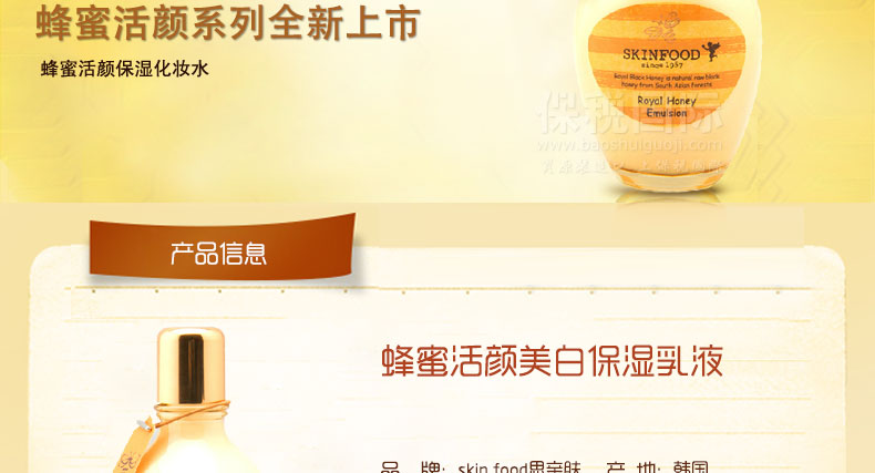 韓國(guó) Skinfood思親膚 蜂蜜活顏保濕乳液 富含皇家蜂蜜 持久保濕滋潤(rùn)150ml/瓶—— 1、長(zhǎng)效保濕。富含豐富維生素、礦物質(zhì)、蛋白質(zhì)、氨基酸。給肌膚長(zhǎng)達(dá)48小時(shí)潤(rùn)澤 2、勻凈剔透。皇家蜂蜜富含12中蛋白質(zhì)、20多種氨基酸、16種以上維生素,增強(qiáng)細(xì)胞活力。 3、重?zé)∧w光彩。蜂膠富含豐富而獨(dú)特的生物活性物質(zhì)使肌膚平滑潔白。 |