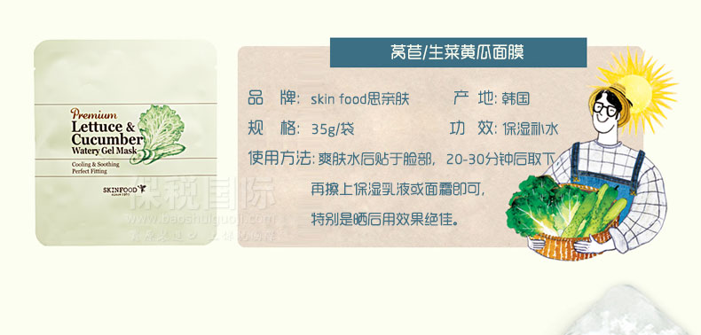 ![]() | 商品名稱 | 韓國 思親膚Skin Food 生菜黃瓜補水敷貼式面膜 補水保濕 煥發肌膚活力 | ||