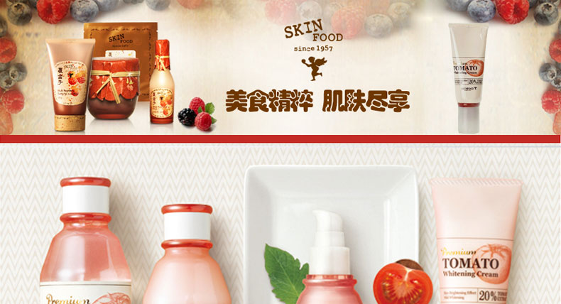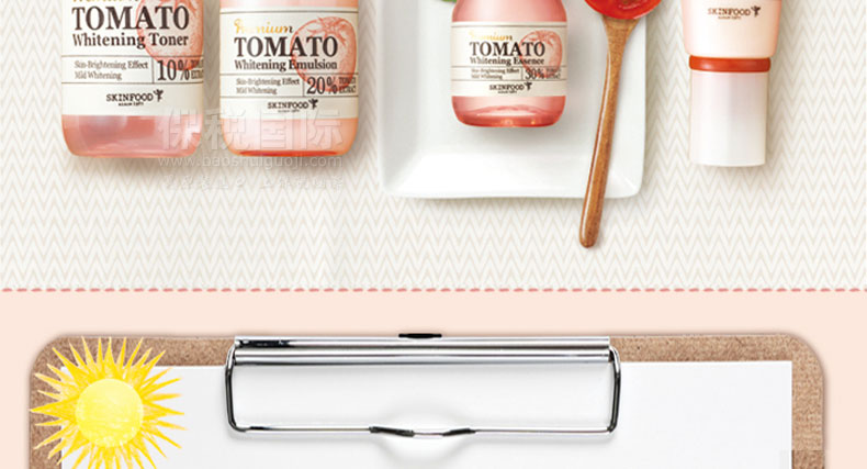 韓國 Skin food思親膚 頂級番茄西紅柿美白保濕面霜 清爽保濕霜—— 1、舒緩肌膚,保濕補(bǔ)水,夏日肌膚零負(fù)擔(dān)。 2、收斂毛孔,恢復(fù)肌膚平衡,瞬間補(bǔ)充水分。 3、保濕美白,緩解皮膚暗沉。 4、富含西紅柿萃取物20%及豐富的維生素c。 |
